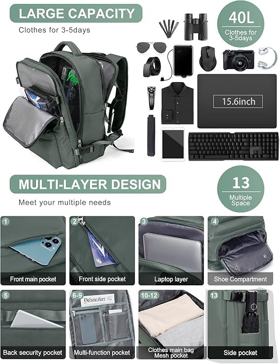 - 【Spacious 40L Capacity & Carry-On Approved】 This large travel backpack offers 40 liters of storage, suitable for 3-5 days of clothes. Meets most airline carry-on size restrictions, perfect for business trips, vacations, hiking, or weekend getaways.