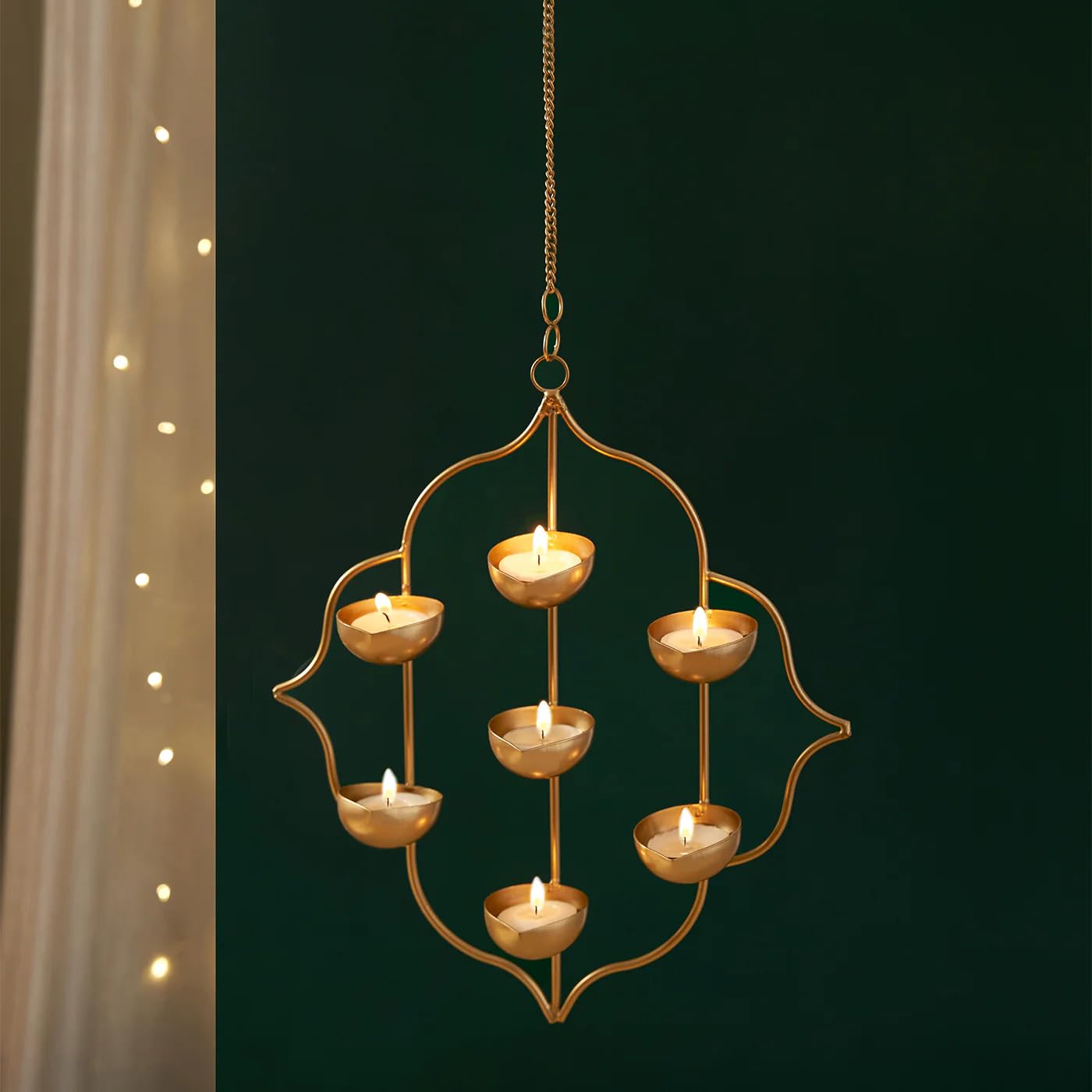 - ✨ Elegant Festive Design – Features 7 diya-style tealight cups arranged in a stylish symmetrical frame, spreading a radiant glow perfect for Diwali, Navratri, weddings, and special occasions.