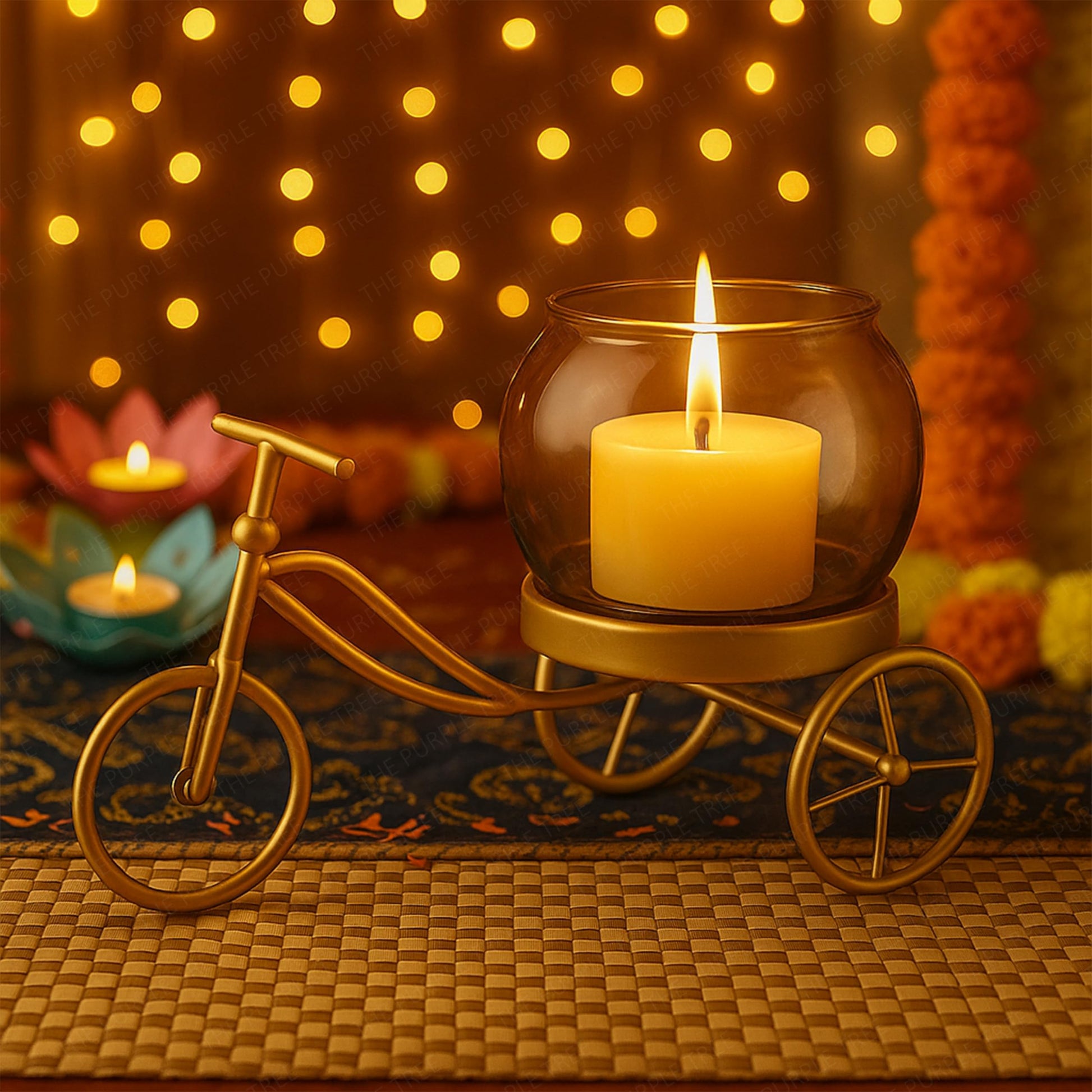 ✨ Unique Festive Design: Elegant golden cycle-shaped tealight holder with glass jar – a stunning piece for Diwali home décor, pooja room, or festive gatherings.